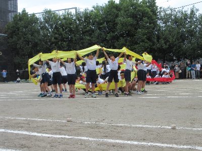 (4年生)「風にのせて つながる空へ」前半はボディーパーカッション、後半はリボンを使った元気なダンスです。カラフルなリボンで表現した波が校庭に広がりました。