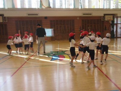 アリーナをのぞくと、2年生の子どもたちが忍者になる修行に挑戦していました。先生が投げる手裏剣をかわそうとジャンプしたりしゃがんだり、ノリノリで取り組んでいます。