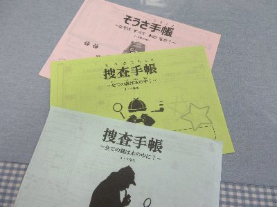 捜査手帳の中を見ると、読書や分類番号などとつながる謎解きがいっぱいです。図書室を出ると、早速、手帳をもって来室する子に会いました。本に親しめる環境づくりを進めています。