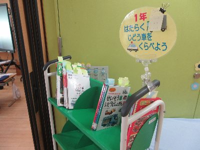 今回は、自分で選んだ車について調べていきます。ブックトラックには、車の本がいっぱいです。机の上には、ロードローラーやパトカー、清掃車などたくさんの車が並んでいました。