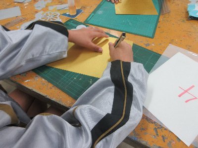5年生が、展覧会で会場を彩る飾りづくりに取り組んでいました。金銀の画用紙から、カッターで切り抜いていきます。