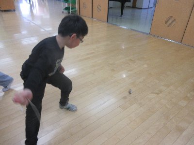 後半はアリーナで、作ったばかりのおもちゃで遊びました。私に方へ向けてキラキラの付いたひもつきボールを投げてくれる子もいて一緒に遊びました。あっという間の45分となりました。