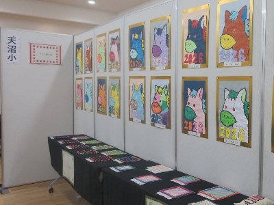 こだま学級の子どもたちと、セシオン杉並で開催されている特別支援学級連合展覧会に行ってきました。会場には、平面や立体の力作が並んでいます。天沼小からは、干支のちぎり絵とスウェーデン刺繍を出品しました。