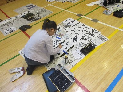 今日はアリーナで4年生が書初めに取り組みました。先週から1日ごとに各学年が取り組