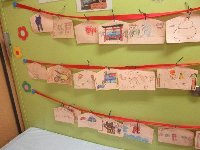 校内を回っていると、1年生の教室の前で今年や3学期の目標が書かれた手作り絵馬を見付けました。写真のように、各クラスにかわいい絵馬が飾られています。