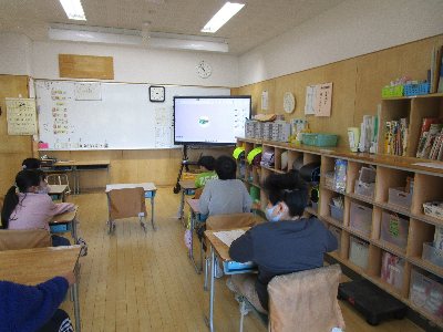 写真は、こだま学級の子どもたちが教室からオンライン朝会に参加している様子です。