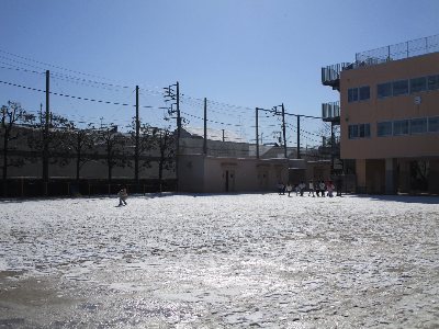 先週末は都内でも雪が降り、9日(月)朝の校庭は写真のような雪景色となりました。積