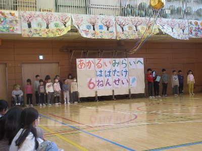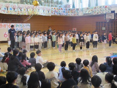 1・4年生からは歌や呼びかけのプレゼントがありました。聞いている6年生も笑顔です。