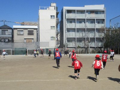 ゼッケンを着けている子が鬼役です。鬼に捕まらないように、トラックの中を上手に逃げている子がたくさんいました。寒さに負けず体を動かす天沼小の子どもたちです。