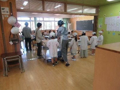 14日から1年生も給食が始まっています。食べるだけでなく、準備や片付けもできる限り自分たちで行います。はじめは、なかなか大変です。