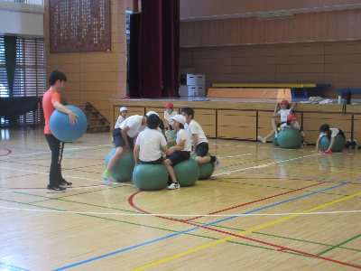 アリーナでは、5年生がGボールに挑戦! ボールにのったり、座って手をつないだり、自然と様々な動きが見られ広がっていきます。運動を通して体を動かす楽しさを味わって欲しいです。