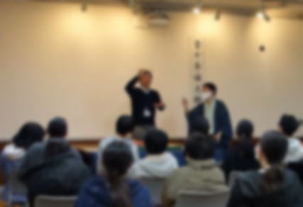 | <令和3年12月4日> ☆☆☆ 土曜授業(伝統文化)その3 ☆☆☆ そばを食べる演技 実際に落語を聞きました! (某先生がチャレンジ中) 3年 落語入門 3年生 落語入門の様子です。落語家の方にお越しいただき、落語の歴史、 面白さ、楽しみ方をお話いただいあと、実際に落語を聞きました。 進路に向かっている3年生にとって日本の言葉の文化を知るとともに、温かい 笑いに包まれたひと時となりました。 <R3.12.7UP> |