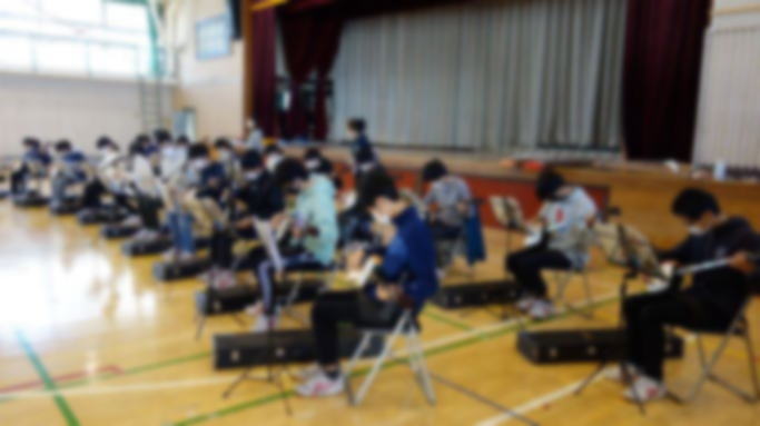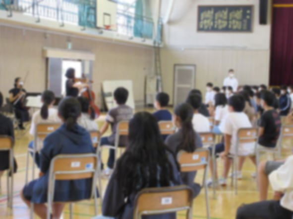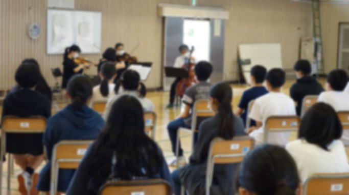 | <令和3年10月4日> 1年生音楽鑑賞教室のため、日本フィルハーモニー交響楽団の方が来てくださりました。電子媒体ではない、楽器から奏でられた音を直接鑑賞できる「生演奏」を聴くことができる貴重な機会をいただきました。 <R3.10.4UP> |
