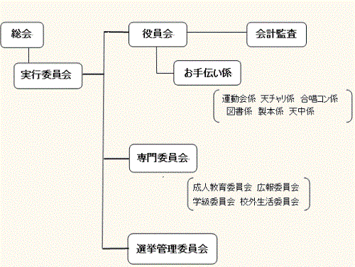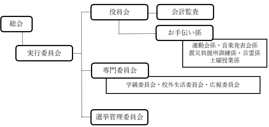 | 役員会 | 会長:1名 副会長:3名 書記:2名 会計:2名 (その他、教職員からも数名配置) |