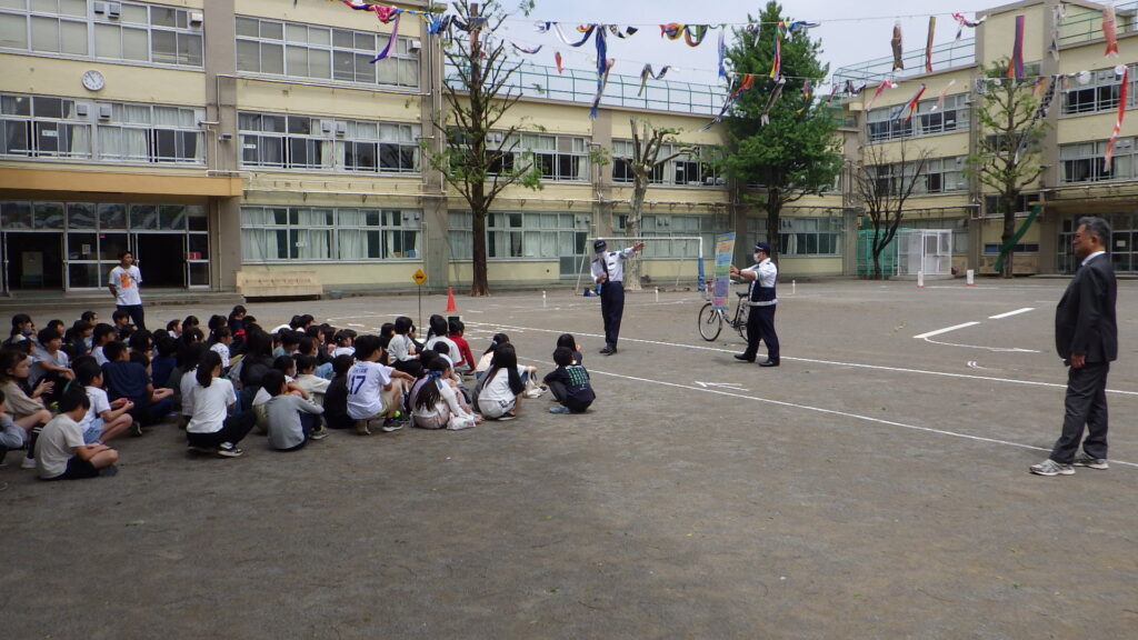 4月24日(木)の3,4時間目に、高井戸警察署の方を招いて、自転車安全教室を行いました。自転車は、車の仲間であることをはじめ、様々な守らなければいけないルールがあることを事前に学習したり、講師の先生からお話をしていただいたりしました。