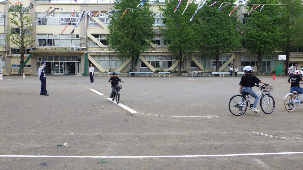 いざ、安全に自転車に乗る実技。子供たちは楽しみながらも、真剣に取り組みました。今回学んだことを日頃の生活に活かしていってほしいです。