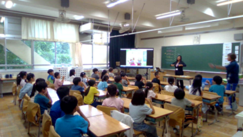 最後はとても大きな外国の絵本の読み聞かせもしてもらいました。知っている英単語があると、積極的に発音する子供たちの様子が見られ、外国語に親しむことができた1時間でした。2年生でも、外国語の授業は年間を通じて計画的に実施されます。