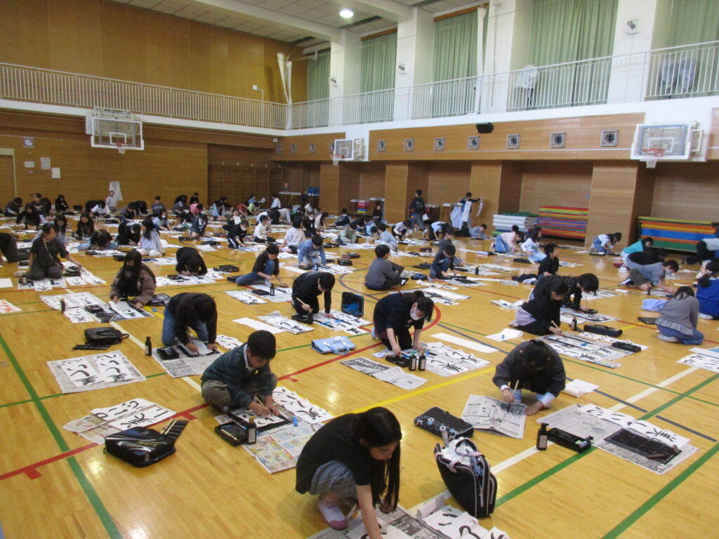 15日(木)の3,4時間目に、4年生は体育館で席書会(書き初め)を行いました。子供たちにとって、体育館で行う席書会は2度目です。準備をしたり、心を落ち着けて書いたりしました。
