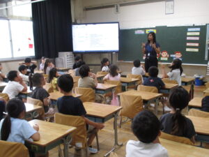 1年生が楽しみながら外国語に触れられるようにゲーム要素(じゃんけん列車やばくだんゲームのような)を取り入れながら、
