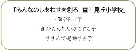 | 令和5年度2学期より、本校は旧校舎に別れを告げ、いよいよ新校舎での生活になります。 この期を生かし「新生・富士見丘小学校」として新たな学校に生まれ変わります。 新しい時代の未来を生きる子どもたちを育てるために、学校教育目標も一新いたしました。 |