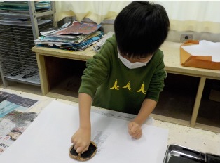 紙で、自分と好きな物をテーマに版を作り、初めての紙版に挑戦しました。