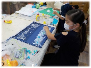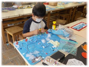 身の周りにあるさまざまな材料を使い、色や形、触った感じから思いついたものを表現しました。