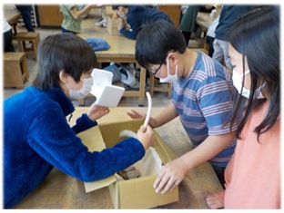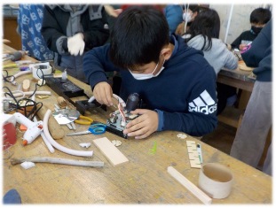 様々な材料の中から、自分の感性で材料を選び取り、試行錯誤しながら立体作品をつくる題材です。