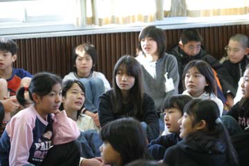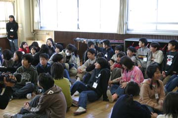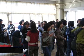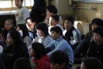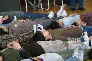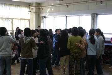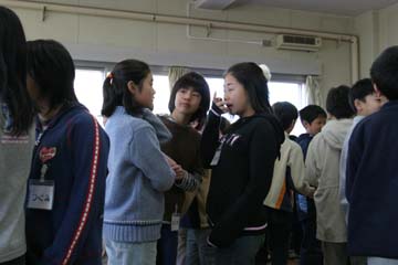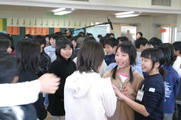 ひとしきり、終わったところで、きちんと仲間集めができたかどうか確かめます。座って、手をあげていくときちんと集められたグループと別れてしまったグループが、「もっと大きな声をださないと全員集められないよ」アドバイスがあります。 |