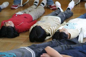 西野さんにバトンタッチ。歌の指導がはじまります。はじめに校歌を歌ってもらってその声を聞き、「では、みなさん床にあおむけにねて歌ってみましょう」楽譜をみせずに、アカペラで歌詞を伝えていきます。