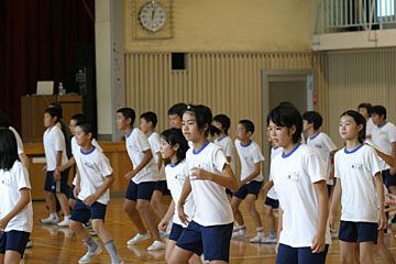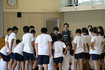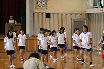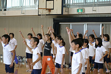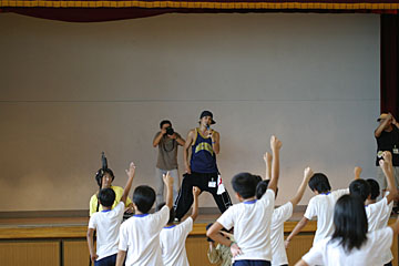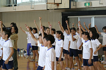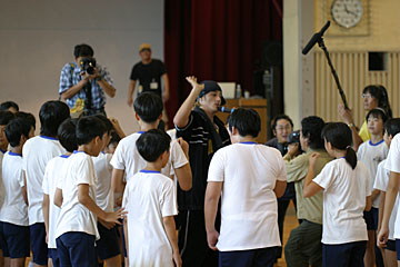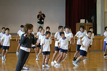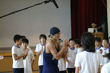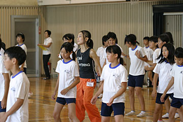 | 今日のメイン講師は本山新之助さん。体育館で体をおもいっきり動かす、ダンスの授業を行いました。 |