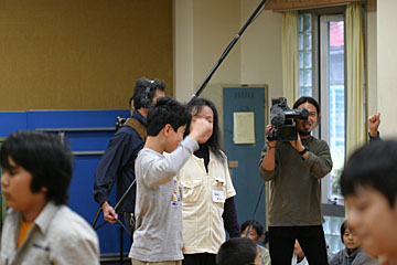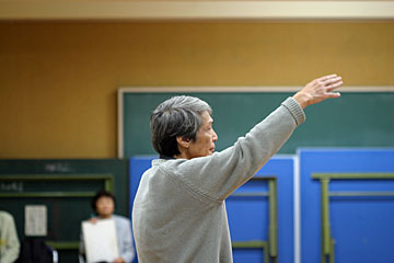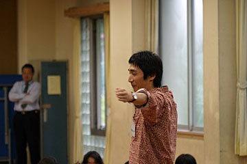 | 今日のメイン講師は青井 陽治さん。これから、2月の卒業公演にむけて継続して講師をしてくださいます。今日は、自己紹介もかねて、「鏡」と「対称」に取り組みました。 |