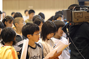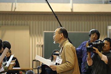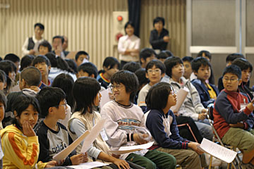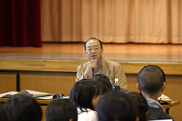 | 今日のメイン講師は小椋 佳さん。子どもたちが書いた詩をもとに歌をつくりあげていく学習です。 |
