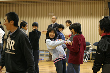 たくさんの友達同士で手をつないで、体をそらしたり、徐々に体がほぐれてきます。 |