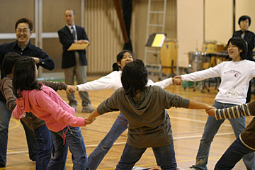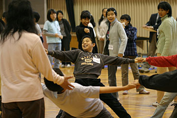 | まずは、劇団扉座の田中さんからの指導で、体ほぐしの運動をしました。大きくジャンプ、2人組で柔軟運動。 | |