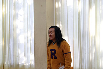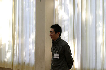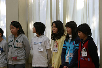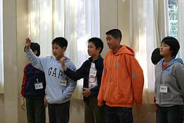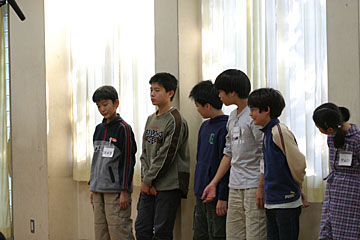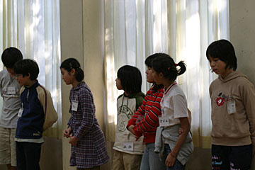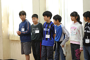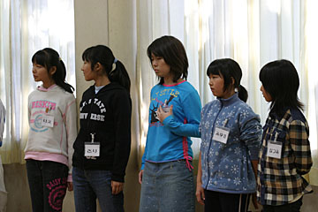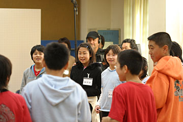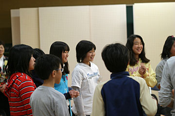 | 青井先生が、ちょっと遅れるということで、田中さんが、前に出て、体や頭をほぐすゲームをはじめました。 | |