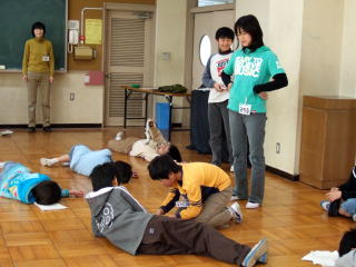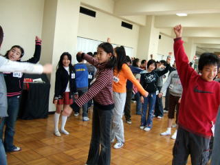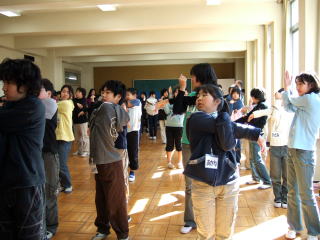 | ウォームアップゲーム その2 ストレッチをした後、息をいっぱいに吸ったり吐いたりして、肺を広げる運動をしました。こうしておくと、声が出やすくなるそうです。この後、3つのグループに分かれての練習に入りました。 |