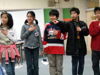 | 「未来の友情」 その2 この時間のめあては、動きを付けて練習することでした。前回から繰り返し言われているように、誰に向かって話しているのか分かるように話す、また、相手にしっかり聞こえるように話す、ということを意識して練習していました。次回までに、台詞をしっかり覚えてくるという宿題が出ました。 |