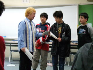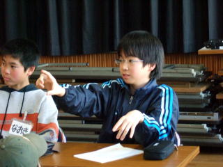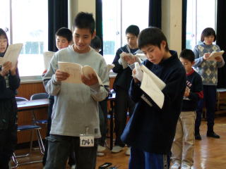 情報交換 いつものように、それぞれの練習についてどのようなことが行われ、どのようなご指導を受けたのかを発表し合いました。ただ、この日の練習は久しぶりに全員そろったことと、卒業遠足を2日後に控えていたこともあってか、今ひとつ集中力に欠けていた印象を受けました。若林先生から、 「本番まで、台本に費やす時間を多くとって、プロの先生の力を引き出すような取り組みをしよう。自分の劇を大事にしよう。」 というお話がありました。子どもたちは真剣に自分を振り返っていました。次からは、合同練習になります。 |