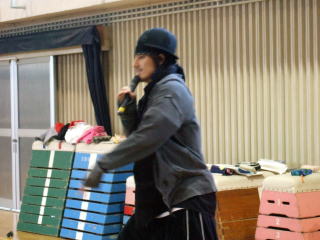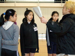 「未来の友情」 体育館で、どこから出てくるか、どこで演じるかを関根さんに説明していただいて練習しました。広い体育館での初めての練習でしたが、これまで誰に向かって話しているかを意識した練習を重ねてきた成果がこの日の練習にも現れていました。 |