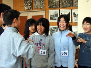| 即興劇・朗読劇 エレベーターのグループでは、信じられないくらい長い間エレベーターが止まっていたらどうなるか、果てしなく上昇して扉が開いたらどのような世界になっていたか、を考えてくることになっていました。それを実際に演じながら作り上げていきました。次第に、イメージがふくらんできたようでした。 |