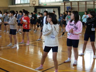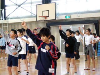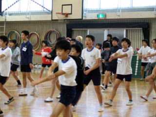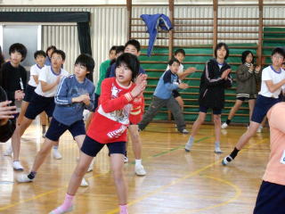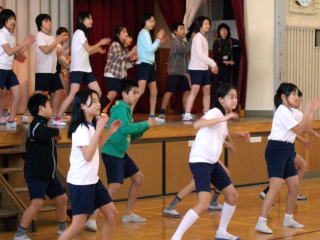 | 1時間練習した後、体育館でダンスの練習に入りました。映画「シャーク・テイル」で使われた曲で踊ります。久しぶりのダンスなので、どうしても思い切り腕も伸びなかったり、曲に乗りきれなかったりしていましたが、本山さんのご指導で、次第に子どもたちは夢中になっていきました。ダンス中心の授業はこの日限りなので、全ての振り付けを覚えた後、それぞれの踊る場所も決めていただきました。 最後に本山さんから、 「自分のために踊ってください。ダンスに限らず、その時間、その時間を大切にして練習しましょう。」 ということを言われました。 |