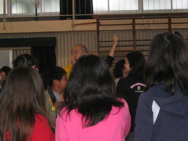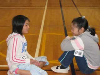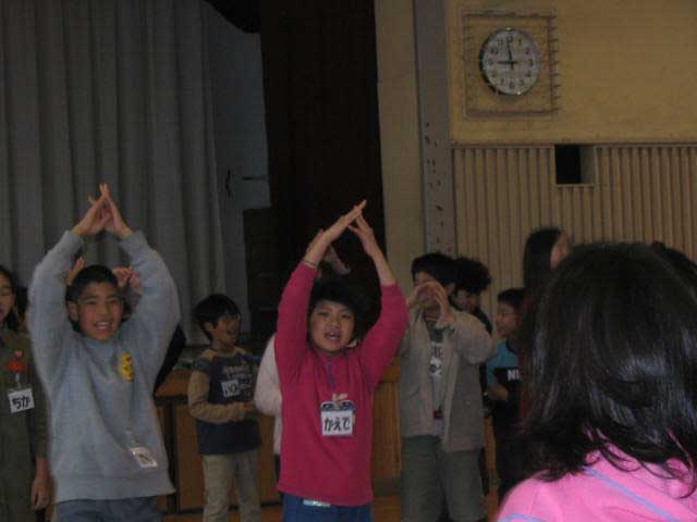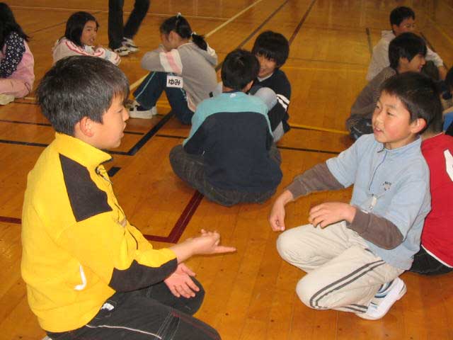 硬い体をほぐし、リラックスするためにウォームアップゲームをしました。 自分の家の電話番号の末尾が同じという仲間を集めました。あちこちから様々な数字を言って元気に呼び合う声が聞こえます。 若林先生も子どもたちといっしょにがんばっています。 |