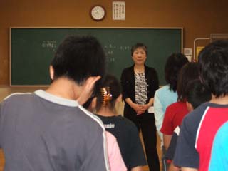今日の授業の確認。 「今日のめあては、みんなで協力し合って場を作り、場を支えるということです。即興劇って知っていますか。今日は、台本なしで劇を作ります。」 |