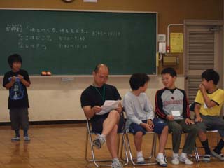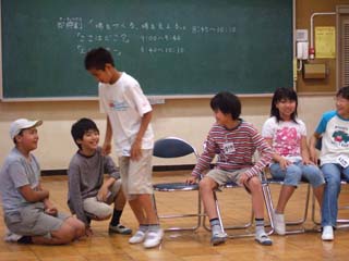 | このグループは、1人目がサッカーのリフティングをしながら入っていき、2人目は椅子に座って様子を見、次の人もサッカーらしきことをして……というようになり、結局「サッカー場」ということになりました。台詞を言うことにより、男の子たちはサッカーを練習している人、女の子2人は、監督またはマネージャーという設定になっていったようです。 |