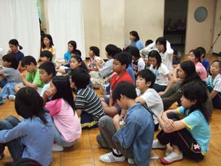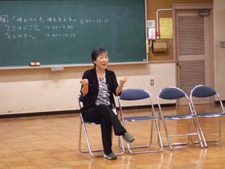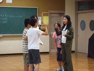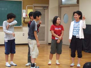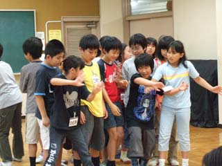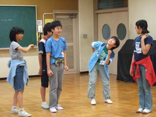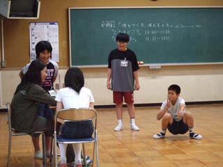 今度はどこだか分からないという設定。1人目の人の動きを見て、2人目の人が場を想像した動きで入っていく、また2人目の動きをよく見て3人目が動きを考えて入っていくうちに、だんだん教室という空間が別の空間に見えてきます。そして5人目の人が大きなこえで場所を言っては入り、話しかけ、劇を作っていきます。 |