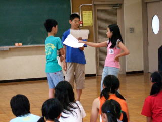 今度は、即興劇を選んだ人たちで行いました。道でぶつかった2人と、それを止めようとする大人の3人の劇です。途中まで台詞がありますが、途中から自分で考えて台詞を言い、場を作り上げていかなければなりません。始めは吉田さんに入っていただきましたが、あとから子どもたち3人で行いました。