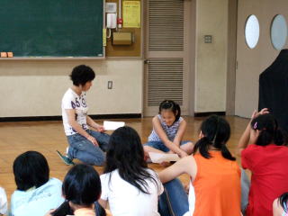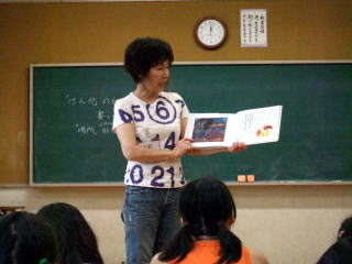 イラクの子どもの絵に谷川俊太郎さんが詩をつけた『お兄ちゃん、死んじゃった』という絵本を、説明しながら朗読してくださいました。また、「みんなが見ている星と同じ星を、イラクの子どもたちも見ています。そんなことを考えながら歌います。」と言って、最後に宮沢賢治さんが作った『星巡りの歌』を、歌ってくださいました。