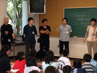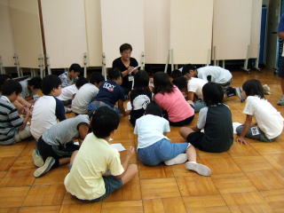 | 篠原久美子さんのグループ サラエボとコソボのこどもの手紙の台本を元に演じるグループ。 まずは、それぞれの国の様子の説明を受け、子どもたちはイメージをふくらませています。 |