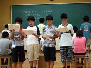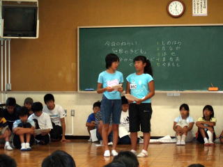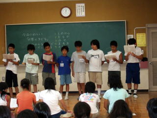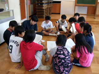 篠原久美子さんのグループの発表 男子と女子に別れ、互いに向かい合う形で手紙を読むという発表をしました。 |