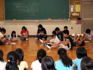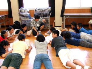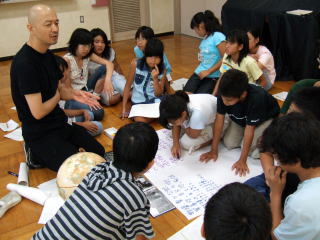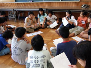 長谷基弘さんのグループ サラエボの子どもの手紙の台本を元に演じるグループ。内戦の様子などの説明を聞きました。海岸に打ち寄せられた手紙を拾って読むという演出内容も聞かされ、子どもたちはイメージをふくらませ、練習を始めました。 |
